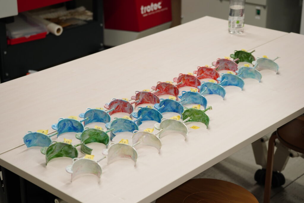 - アイデア創出:ペットボトルキャップの再利用方法をテーマに、約2か月間の議論を重ね、3Dプリンターやレーザー加工機を使ってプロトタイプ(試作品)を制作しました。